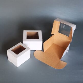 Baltas kartona kastītes bez lodziņa. Tās būs piemērotas dažādiem konditorejas izstrādājumiem.